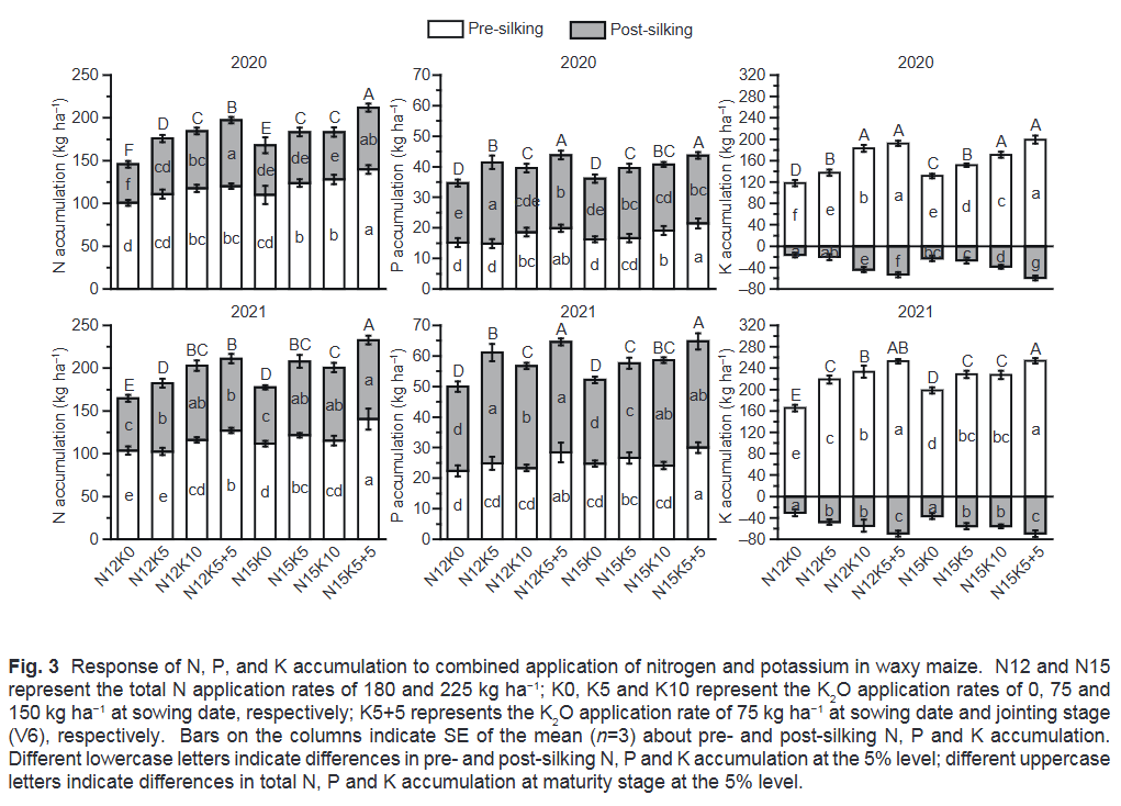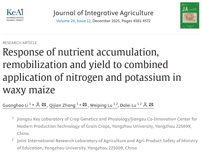 近期,我院玉米栽培生理研究陆大雷教授课题组完成的题为“Response of nutrient accumulation, remobilization and yield to combined application of nitrogen and potassium in waxy maize”的研究在Journal of Integrative Agriculture (《农业科学学报(英文)》,JIA) 2025年12期正式发表。