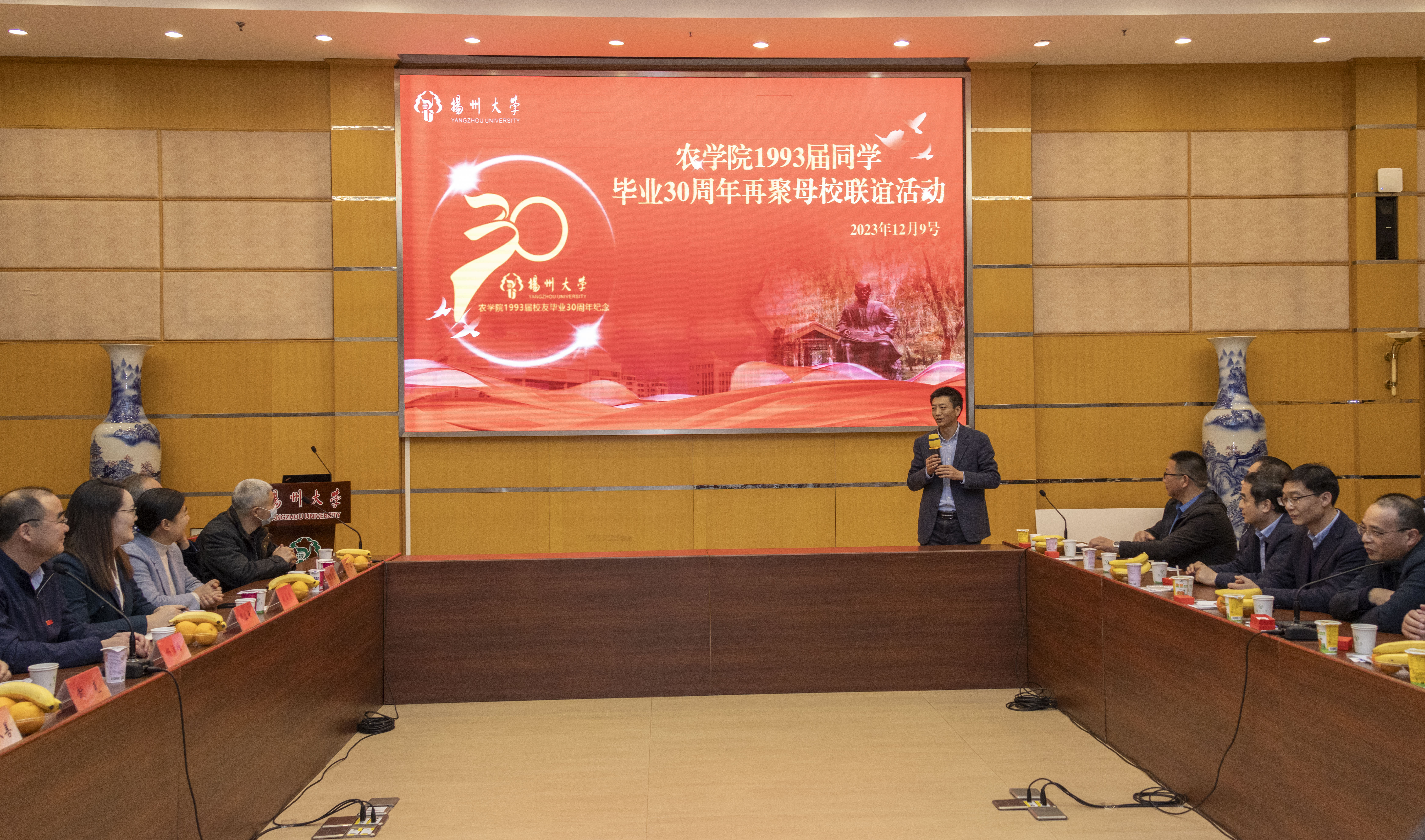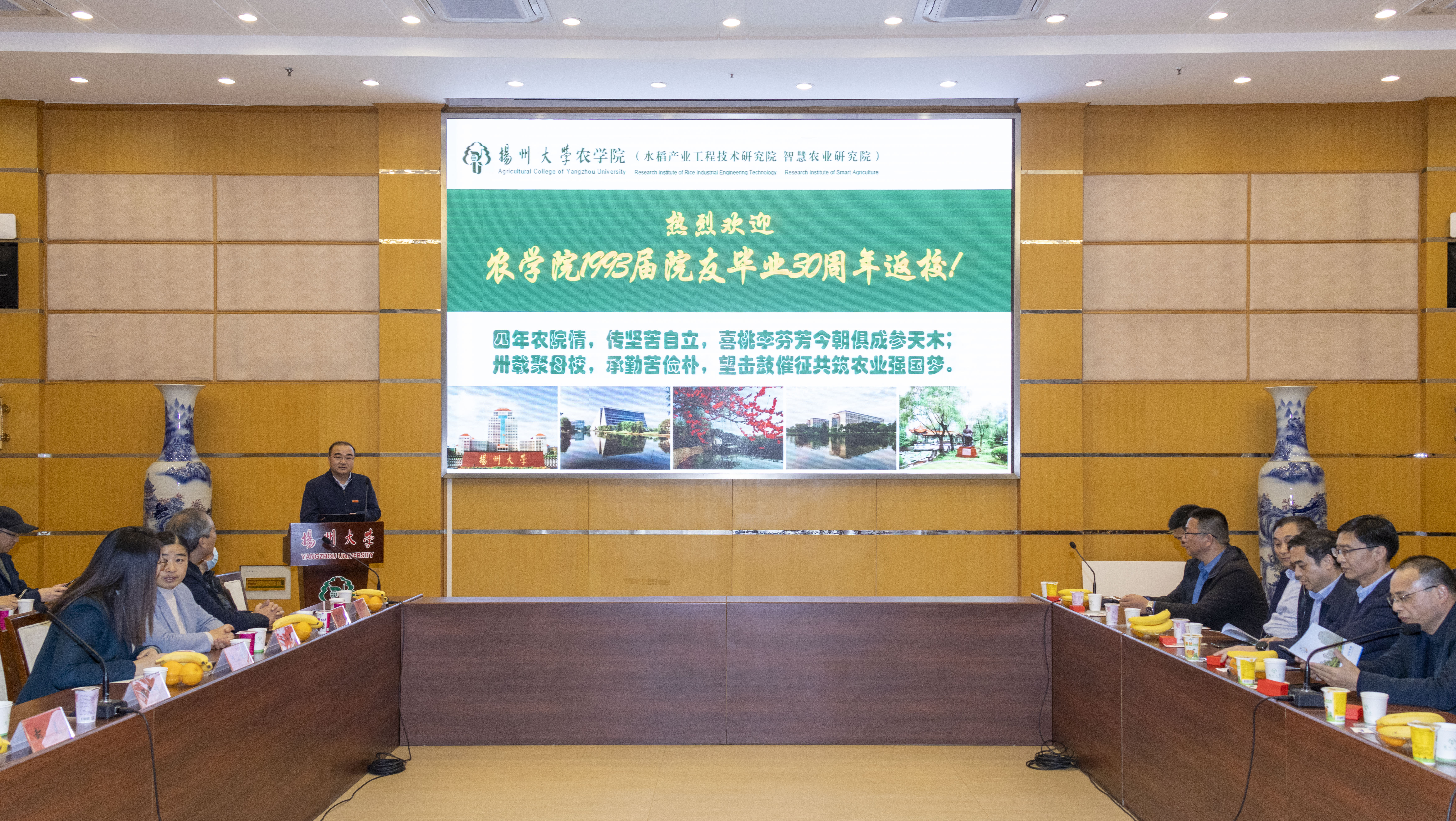 1993届师生代表齐聚荷花池主楼多功能报告厅,共同观看了扬大百廿校庆宣传片,回顾建校百廿风雨,重温校内各处风光。我院院长杨泽峰对校友们毕业30周年返校表示诚挚欢迎。他向校友们介绍了近年学院事业发展情况,并由衷感谢各位校友30年来始终心系母校;身处各方发光发热,不辍支持学院。在“感恩母校,助力育人”捐赠仪式上,校友们纷纷慷慨解囊,感念师长谆谆教诲,反哺母校。
