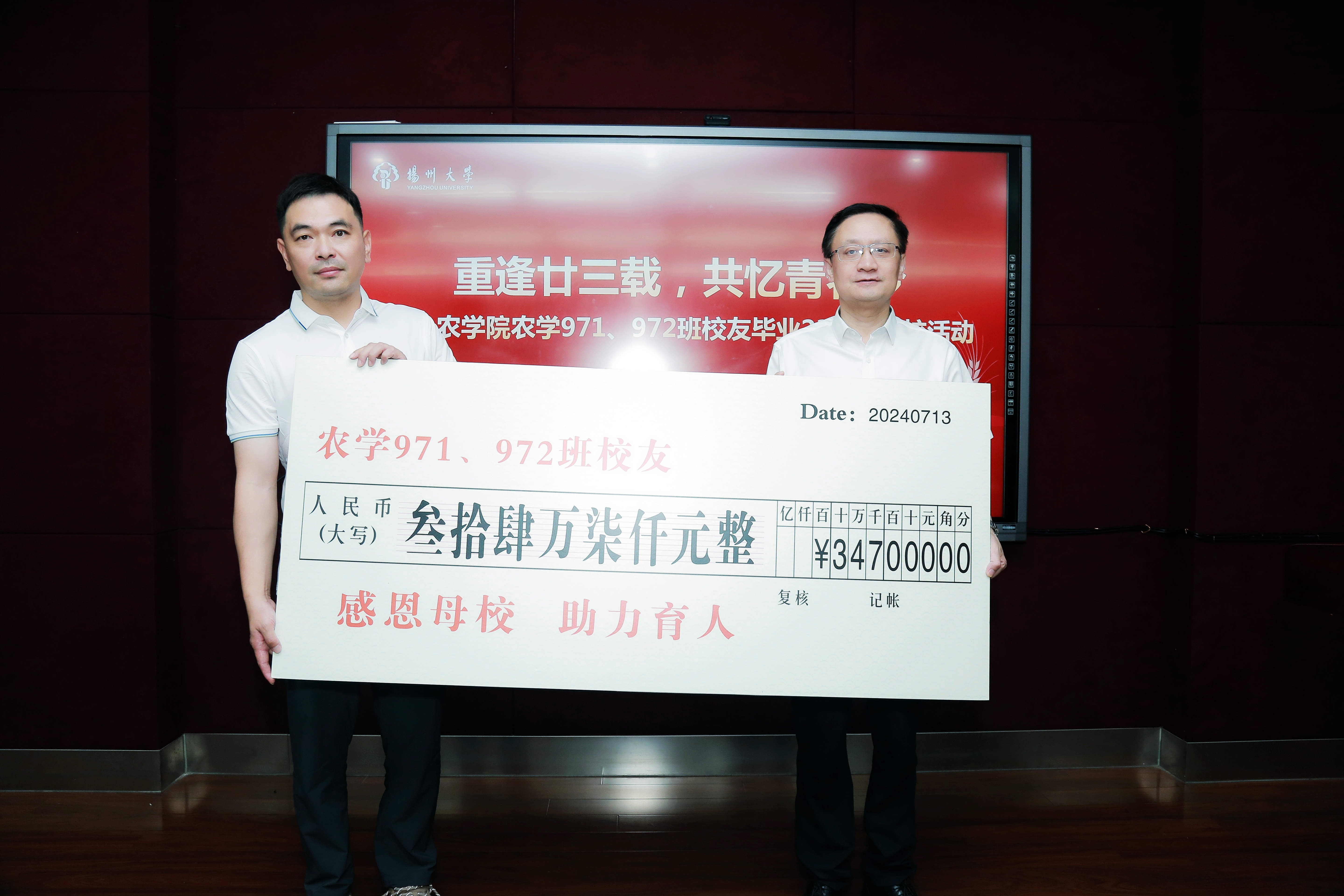 为表感激,助力母校、母院事业发展,两个班级同学共同捐赠34.7万元人民币。其中4.7万元作为“农学院学生活动基金”,30万元设立“农学院‘致为中福’拔尖创新农科人才奖励基金”,陈克勤主任代表学校接受捐赠,并为校友代表江苏致为化工有限公司、扬州中福生物技术有限公司创办人马进颁发捐赠证书,周立云副书记代表学校向校友代表赠送徽章。