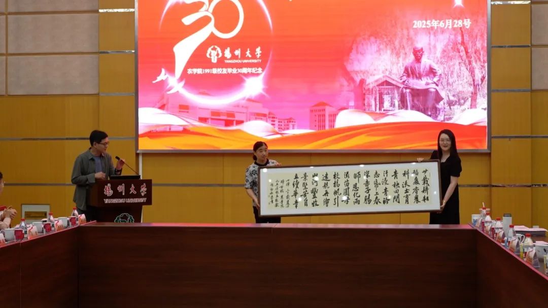 农教911班校友赵劲松向母院捐赠书法作品,并向与会老师和同学们介绍书法作品寓意,院党委副书记周立云、副院长魏海燕代表母院接受捐赠。