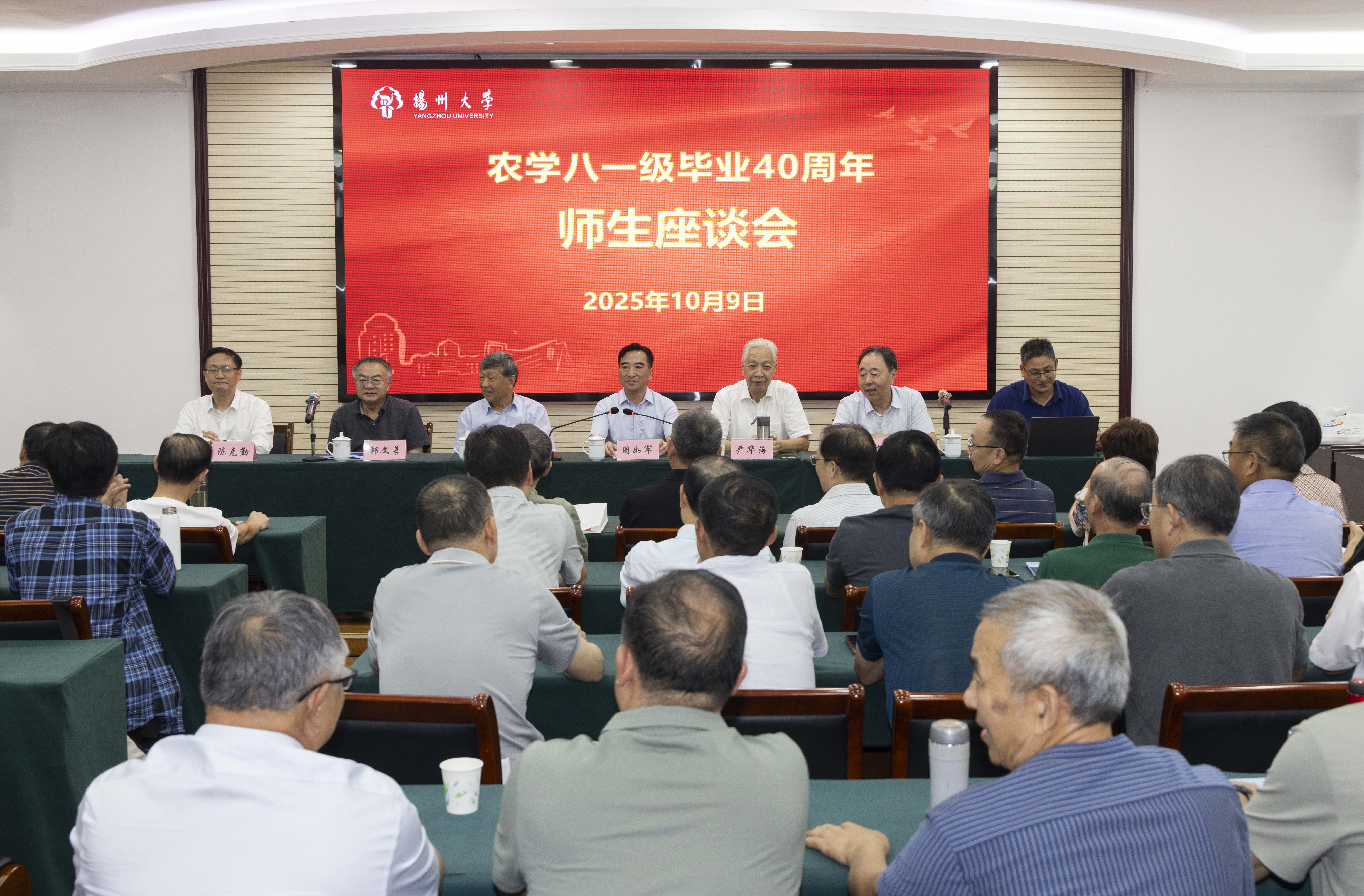 10月9日,我院农学81级校友举办毕业40周年再聚母校联谊活动。校长刘巧泉会见校友并合影留念。校党委副书记、校友会副会长周如军出席座谈会并讲话。时任教师代表,中国工程院院士张洪程,校纪委原书记严华海,南京林业大学原党委书记、三江学院党委书记封超年,农学院原党委书记郭文善等应邀出席活动。农学81级校友、镇江市人大常委会二级巡视员胡敖成主持座谈会。校长办公室主任周保垒,校对外联络办公室主任、校友会基金会秘书长陈克勤,院党委书记施林峰,院长陆大雷,院党委副书记崔益军等参加相关活动。