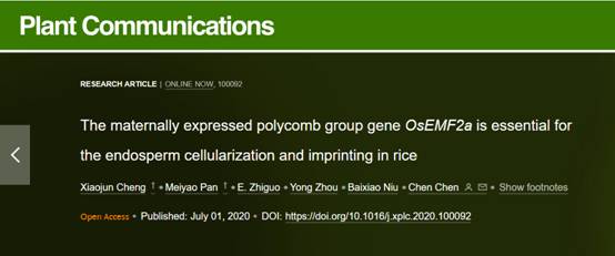 7月1日,我室陈忱教授研究团队在《Plant Communications》在线发表论文,题目为“The maternally expressed polycomb group gene OsEMF2a is essential for the endosperm cellularization and imprinting in rice”,该研究为深入理解水稻胚乳的发育调控以及基因组印记形成机制提供了新的发现。