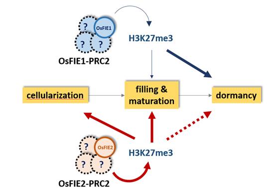 该研究发现OsFIE1是通过一次距今较近的OsFIE2复制事件产生的,只有稻族植物存在其同源基因;在稻属植物演化过程中,OsFIE1蛋白在N端产生了一段额外的序列;相较于OsFIE1以及其他PRC2成员,OsFIE2经历了显著的纯化选择。通过构建OsFIE1和OsFIE2的嵌合基因并在水稻中过量表达,证明OsFIE1的N端额外序列并不是造成OsFIE1和OsFIE2过表达植株表型差异的原因;在胚乳中特异过量表达OsFIE1能够导致种子变小。进一步通过创制OsFIE1和OsFIE2的CRISPR/Cas9敲除突变体材料,发现OsFIE1突变对种子早期发育的影响较小,但是osfie1籽粒显著变小、穗发芽明显增加;而OsFIE2突变导致胚乳细胞化过程受阻,无法获得osfie2纯合突变体。对osfie1,osfie2以及osfie1,2双突材料胚乳的转录组分析表明,OsFIE1和OsFIE2对一些贮藏蛋白合成以及光合作用基因的表达调控存在加性效应。该研究证明了OsFIE1和OsFIE2在调控种子发育中的功能发生了分化,OsFIE1主要在种子发育后期发挥作用,而OsFIE2对胚乳早期发育特别是细胞化过程中是必需的。
