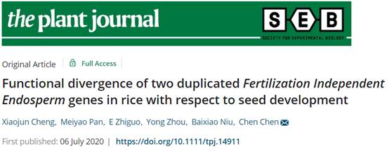 7月6日,我室陈忱教授课题组的最新研究成果在国际著名期刊《Plant Journal》在线发表论文,题目为“Functional divergence of two duplicated Fertilization Independent Endosperm genes in rice with respect to seed development”,该研究证明了OsFIE1和OsFIE2在调控种子发育中的功能发生了分化,OsFIE1主要在种子发育后期发挥作用,而OsFIE2对胚乳早期发育特别是细胞化过程中是必需的。