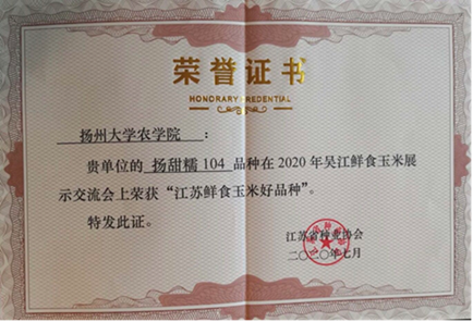 我室印志同教授团队在充分挖掘鲜食玉米优异种质的基础上,采用常规育种技术与分子标记辅助选择育种技术结合方法,高效重组、聚合糯玉米、甜玉米种质优异基因,成功育成甜糯型优质鲜食玉米新品种扬甜糯104。扬甜糯104于2020年6月通过江苏省农作物品种审定委员会审定。该品种口感又甜又糯,香味浓郁,产量高,抗逆、抗倒性强。2020年7月,在江苏省种子站举办的吴江鲜食玉米展示观摩活动中,由国内权威鲜食玉米育种家、企业代表组成的专家评委,从田间表现、外观商品性及食味品质等方面对参加展示的近200个鲜食玉米品种进行了现场品鉴和评选,扬甜糯104被评为“江苏鲜食玉米好品种”。