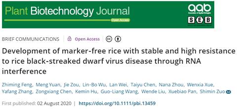 8月2日,我室水稻抗病分子育种团队的最新研究成果在国际著名期刊《Plant Biotechnology Journal在线发表论文,题目为“Development of marker-free rice with stable and high resistance to rice black-streaked dwarf virus disease through RNA interference”,该论文报道了通过RNAi技术获得稳定的高抗黑条矮缩病无标记转基因水稻新品系的研究。