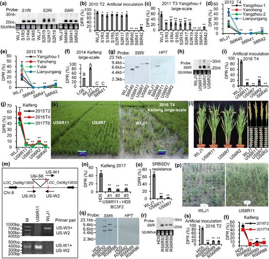 研究人员首先创建并获得了分别针对水稻黑条矮缩病毒片段S1、S2和S6的RNAi转基因水稻,进而通过人工鉴定和自然鉴定,证实以S6为靶点的RNAi(S6RNAi)转基因水稻对黑条矮缩病毒几乎免疫。进一步采用无标记转化策略,在江苏优质推广品种武陵粳1号(WLJ1)背景中,分别创建了由玉米Ubiquitin启动子和水稻绿色组织特异表达启动子Osrbcs驱动S6RNAi表达的无标记转基因水稻。通过详实的分子数据分析和连续多年多重复的抗性鉴定,最终获得了抗性稳定遗传且综合性状优良的无标记S6RNAi转基因水稻。研究还发现该转基因水稻对南方水稻黑条矮缩病毒同样具有较强的抗性。进一步通过传统杂交育种并结合分子标记辅助选择技术,研究人员还将转基因水稻中的S6RNAi结构成功转入了江苏目前大面积推广的粳稻品种淮稻5号(HD5)中,同样获得了高抗新材料,证明本研究中获得的高抗黑条矮缩病无标记转基因水稻具有较高的育种应用价值。相关转基因水稻为进一步的转基因安全性评价和商业应用提供了材料基础。