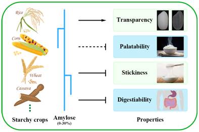 一般而言,中至低等直链淀粉含量的淀粉食品往往具有更好的适口性,但消化速率较快;而高直链淀粉食品尽管适口性较差,但消化慢,有利于预防II型糖尿病和肥胖症等。因此,选择恰当的直链淀粉含量,平衡淀粉适口性与消化速率对于培育具好吃又健康的新型作物品种具有重要意义。基因组编辑技术的出现为在“老”Wx等位基因基础上创建更多“新”Wx有利等位变异进而精确调控直链淀粉含量提供了可能。