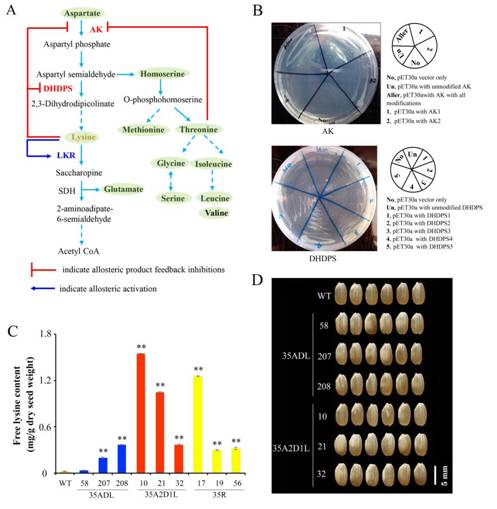 赖氨酸是禾谷类作物种子中的第一限制性必需氨基酸,因其含量较低而限制了其它氨基酸和蛋白质的吸收利用,进而会导致以禾谷类为主要食粮的人们和动物出现营养不良。因此,提高谷物中赖氨酸含量,尤其是水稻中赖氨酸的含量对于提高其营养价值和预防营养缺乏症具有至关重要的意义。为了降低水稻内源AK和DHDPS对赖氨酸的反馈抑制,该研究对水稻AK和DHDPS蛋白的抑制靶标位点进行了点突变,获得了2个水稻AK突变体(AK1和AK2)和5个水稻DHDPS突变体(DHDPS1-DHDPS5)。跟水稻自然AK和DHDPS酶序列相比,每个突变体中仅含有单个氨基酸替换,且预测它们的蛋白序列均不具有致敏性。将突变后的蛋白在大肠杆菌中重组表达,结果显示这些重组蛋白对12mM浓度范围内的赖氨酸类似物AEC(S-(2-氨基乙基)-L-半胱氨酸)均不敏感(图B)。将突变的AK和DHDPS导入水稻,转基因成熟种子中游离赖氨酸含量显著升高,特别是含有突变的AK2和DHDPS1的成熟籽粒,其游离赖氨酸含量分别比未转化的野生型水稻提高了6.6和21.7倍。在此基础上,通过过表达修饰的AK2和DHDPS1,同时抑制水稻赖氨酸降解关键酶LKR/SDH表达,构建了编号为35A2D1L的多基因转化水稻株系,其游离赖氨酸水平分别比未转化对照(WT)和含有未突变AK和DHDPS的转基因水稻(35ADL)高58.5倍和39.2倍(图C)。35A2D1L转基因水稻籽粒中的总游离氨基酸和蛋白含量也有所提高。这些高赖氨酸转基因株系与亲本相比均表现正常的生长发育和种子表型(图D)。因此,突变的AK2和DHDPS1可用于改善水稻和其他谷物的营养品质。