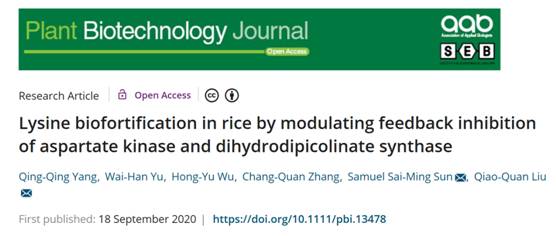 9月18日,我室刘巧泉教授团队和香港中文大学辛世文院士团队合作在国际生物技术著名期刊 Plant Biotechnology Journal在线发表了题为“ Lysine biofortification in rice by modulating feedback inhibition of aspartate kinase and dihydrodipicolinate synthase ”的研究论文。该研究通过单个氨基酸突变,创制了对赖氨酸反馈抑制不敏感或者敏感降低的水稻天冬氨酸激酶(AK)和二氢二吡啶酸合酶(DHDPS),为水稻赖氨酸强化和营养品质改良提供了新思路和新种质。