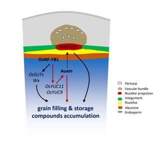 通过筛选水稻转录因子酵母文库,鉴定出41种可能与OsYUC11启动子结合的转录因子,其中核因子Y家族成员OsNF-YB1与OsYUC11共表达。与osyuc11的表型一致,osnf-yb1突变体的籽粒变小,垩白增加,同时吲哚-3-乙酸的生物合成减少。OsNF-YB1可以与OsYUC11启动子结合从而激活其表达。该研究还发现,OsYUC11是一个动态印迹基因,在受精后10天主要在胚乳中表达父本等位基因,随后在受精后15天成为非印迹基因。OsYUC11的功能性母本等位基因能够回复该基因的父本缺陷。
