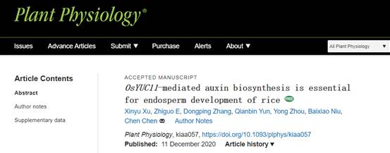 2020年12月11日,我室陈忱教授课题组的最新研究成果在国际著名期刊《Plant Physiology》在线发表论文,题目为“OsYUC11-mediated auxin biosynthesis is essential for endosperm development of rice”,该研究揭示了水稻YUCCA(YUC)黄素单加氧酶编码基因OsYUC11是水稻胚乳中生长素生物合成的关键因子。通过创建OsYUC11的CRISPR/Cas9敲除突变体材料,发现osyuc11的突变对于水稻的营养生长影响较小,然而,osyuc11的籽粒重量却明显降低,成熟的osyuc11种子呈现垩白,外围胚乳通常呈垩白质,而中央胚乳正常。此外,OsYUC11突变也影响了贮藏物质的积累。通过测定内源IAA的含量,发现OsYUC11的功能缺失导致颖果中IAA的生物合成减少,然而,通过施用外源生长素可以回复突变体的缺陷。