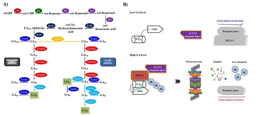 图1.赤霉素合成代谢及信号转导通路 (Wang et al. 2014)