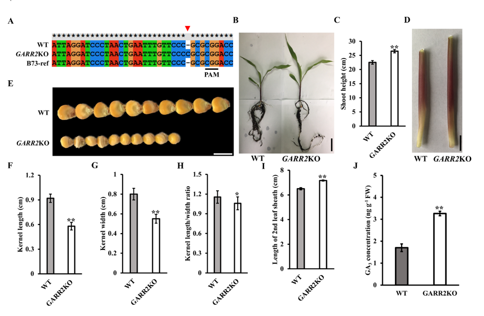 取样对照、赤霉素处理的玉米组织,构建链特异性去核糖体文库,进行高通量测序,发掘玉米赤霉素响应lncRNA (GIBBERELLIN RESPONSIVE lncRNA, GARR)。差异表达分析、表达量验证、序列特征分析、基因编辑实验、生理指标测定等结果表明,GARR2调控赤霉素响应 (图2)。