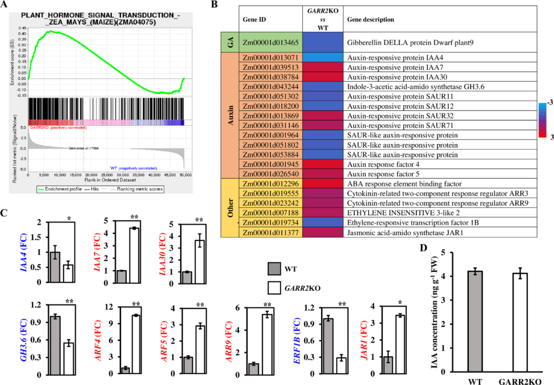 旨在进一步解析GARR2介导的转录调控网络,对转基因受体、GARR2转基因编辑材料进行转录组测序。差异表达的基因不仅富集于赤霉素通路,并且在生长素通路中显著富集 (图3)。RNA pull-down结果表明,HECT类的E3泛素连接酶ZmUPL1为GARR2靶标。