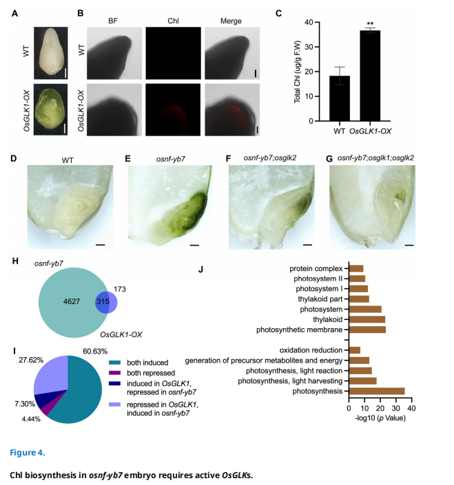 陈忱团队研究发现,水稻LEC1同源基因OsNF-YB7的功能丧失导致水稻胚中叶绿素异常积累,表明OsNF-YB7在调控水稻胚胎叶绿素生物合成中的作用与拟南芥LEC1相反。进一步的功能研究发现,OsNF-YB7与叶绿素生物合成的关键调节因子GOLDEN2-LIKE(GLK)存在物理互作。研究团队通过遗传学和分子生物学手段解析了OsNF-YB7和OsGLK1互作调控绿胚形成的分子机制。