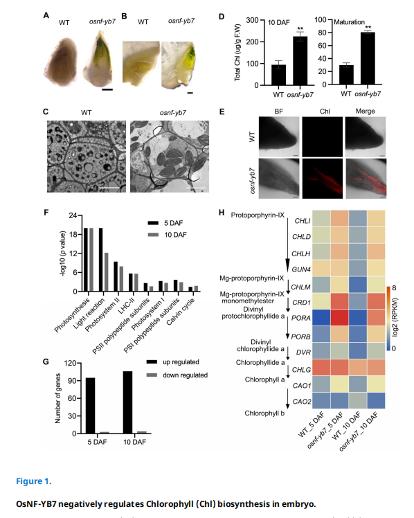 根据植物的胚胎中是否合成并积累叶绿素,可以将不同植物物种分为绿胚植物和非绿胚植物。LEAFYCOYLEDON1(LEC1)作为种子发育调控的关键转录因子,促进绿胚植物拟南芥的叶绿素在子叶中的生物合成。与拟南芥不同,非绿胚植物水稻等禾本科植物胚中缺少叶绿素合成的能力。是何机制决定了禾本植物胚中不能积累叶绿素,目前尚不明了。